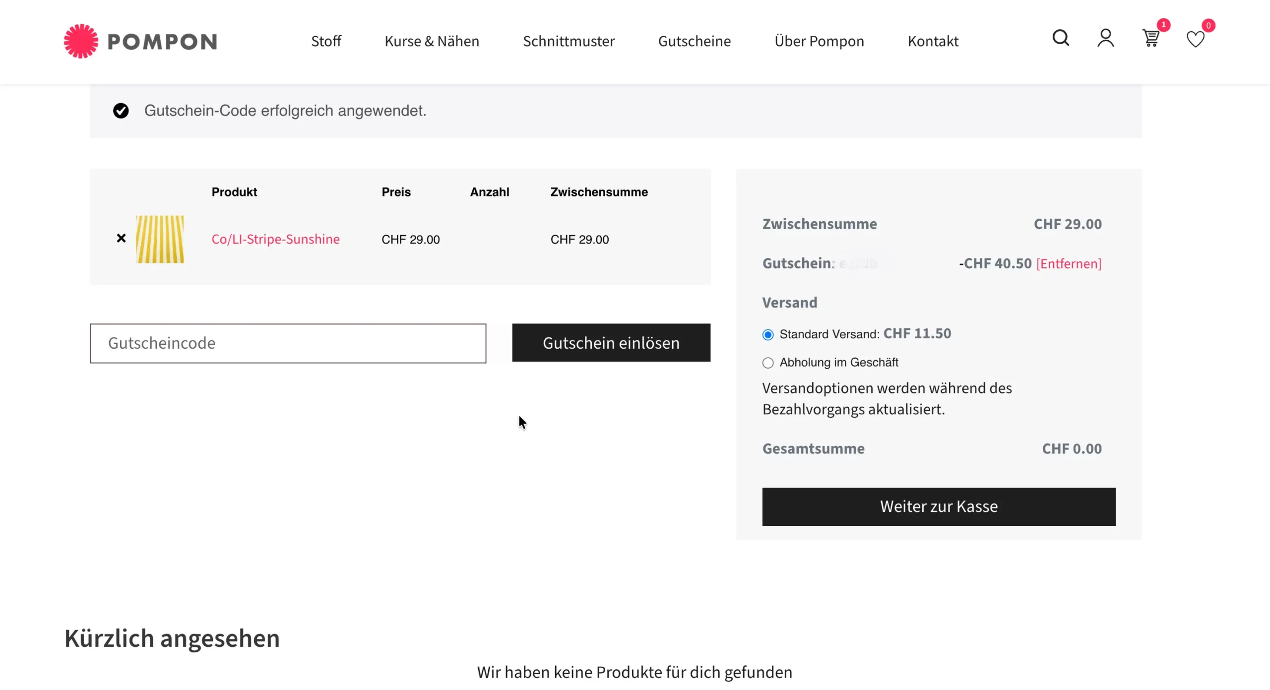 Sie geben den Gutscheincode direkt in den Kassen-Warenkorb ein – das System erkennt den Gutschein automatisch und zieht den Betrag ab.